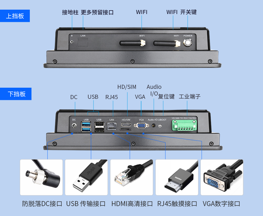 五代工業(yè)一體機(jī)接口分布在上下?lián)醢逦恢?,上擋板:接地柱、預(yù)留接口、WIFI*2、開機(jī)鍵;下?lián)醢澹篋C、USB*4、RJ45、HD/SIM、VGA、AudioI/O、12V GND TX1 TX2 RX2 AB|1 01 02 03,接口豐富,應(yīng)用場景多樣。